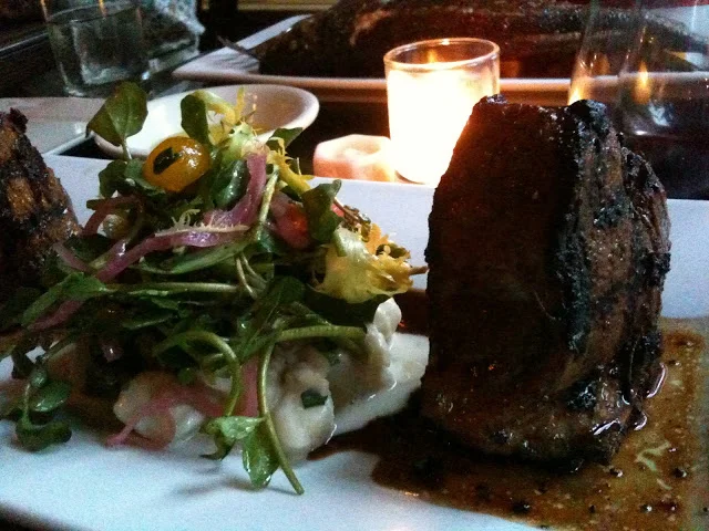 A seasonal special on the menu was this soft shell crab on top of a risotto with asparagus on it. They were nice enough to split our apps so we got both on one plate instead of reaching over to share (+ in my book and they didn't charge extra). I usually don't like soft shell crab that much, but this dish was yummy! I esp loved the risotto.. it had the texture I like about risotto but without the heaviness that usually comes w/ it since it's slathered in cheese.